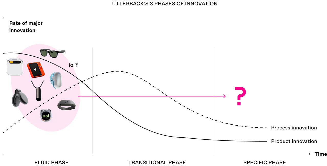 Referring to Utterback’s innovation model2, it’s clear: we are in the “Fluid phase” of AI wearables, meaning the market is characterized by: