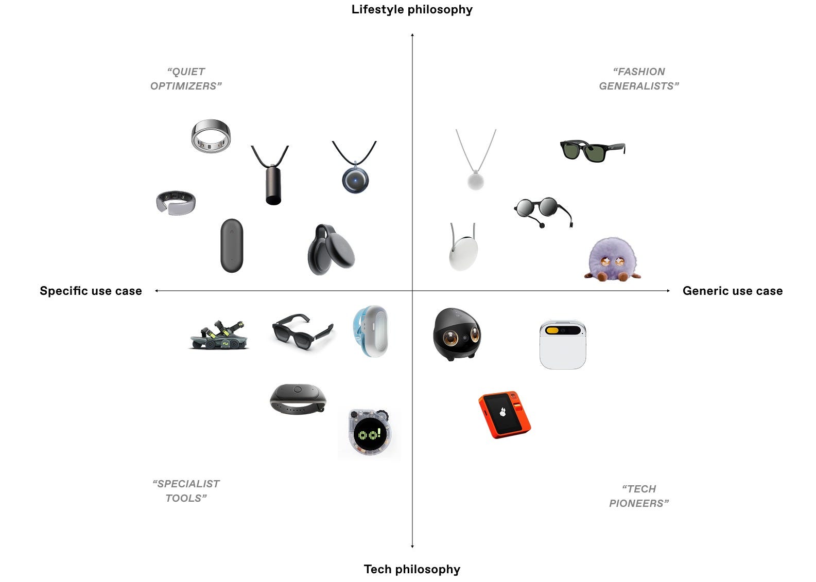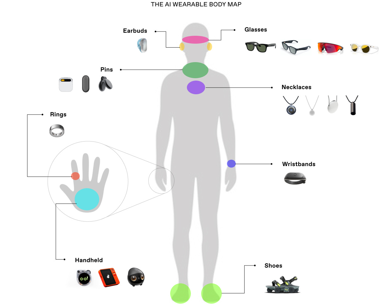 Every company is betting on a different vision of what AI hardware should be. Just look at the explosion of different designs: pins, pendants, glasses, rings, handheld devices, even shoes. This thanks to miniaturization of size (hardware, sensors, chips), increase in computing power and democratization of AI models. It opened opportunities to integrate high tech in tiny objects, plus more freedom in design and aesthetics beyond functionality.