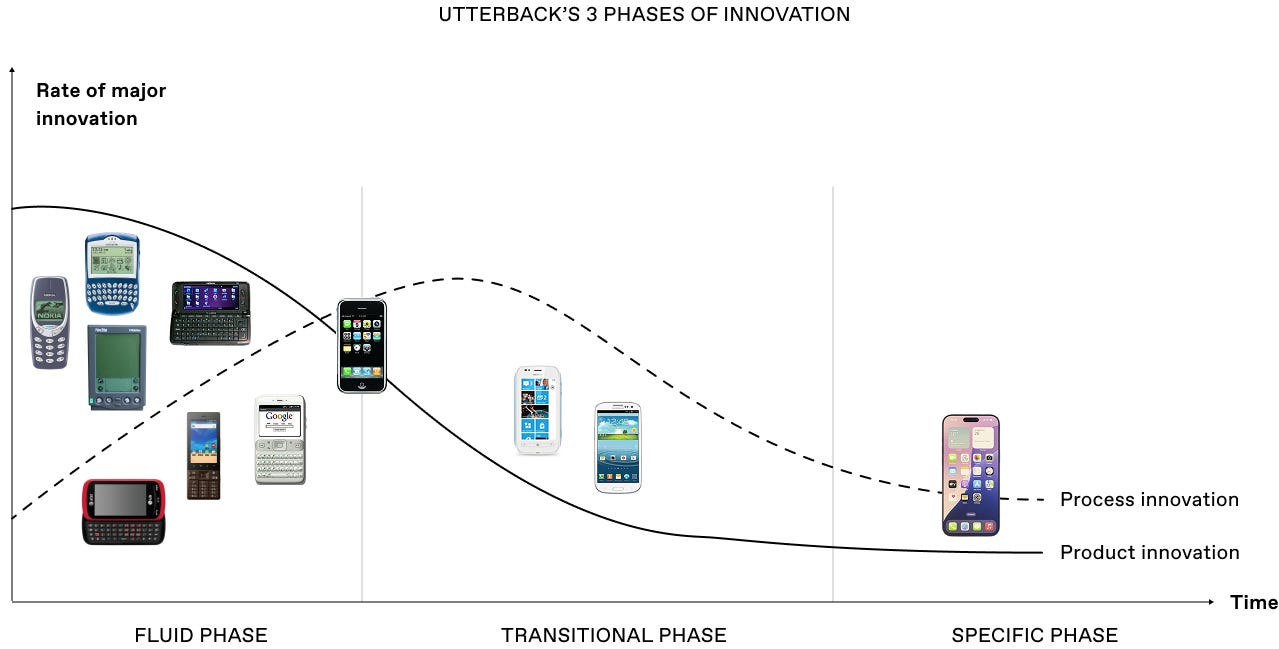 Then the iPhone emerged, with its touchscreen, minimalist hardware, and App Store, as the solution that best matched user needs and became the blueprint that most competitors followed, setting the dominant design and the entry in the transitional phase.